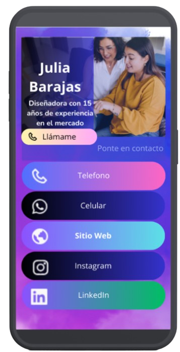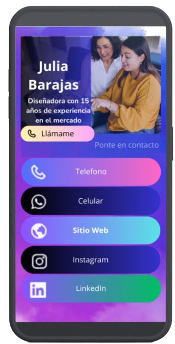 Tarjetas de presentación digitales en donde puedes personalizar con tu información de contacto, redes sociales, fotografías, logotipos, y enlaces a páginas web. Estas tarjetas pueden ser compartidas fácilmente a través de códigos QR, enlaces directos, o mediante aplicaciones especializadas.